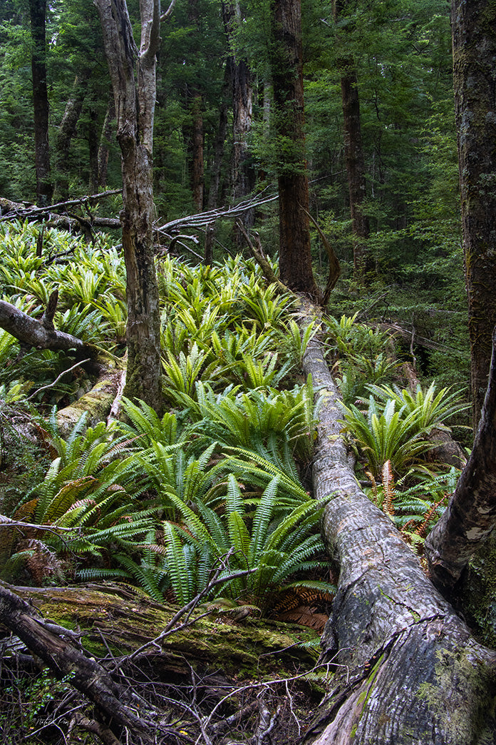 In the deep green hush of Fiordland, a fallen tree becomes something other than an ending. Nestled among ferns, it rests like an old story returned to the forest — softened by rain, stitched with moss, held in place by shade. Walking the Monument Track above Rawiri Bay, you feel how gently this land deals with time: nothing is hurried, nothing is wasted. The air is cool and mineral, the ground springy underfoot, and even decay carries a kind of grace. This is Aotearoa’s southern bush at its most tender, restorative, and profoundly alive.